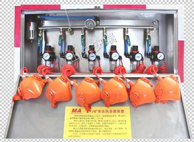 压风自救部分的供气一般采用矿井压风管路,对压风气体进行减压、消声、流量调节,过滤油水等功能,为工作人员提供清新的空气。本装置有安装方便,美观大方,使用寿命长,噪音低,空气清新卫生,不影响视线,人员可在一定的范围内工作活动等优点。供水自救部分前端装一阀门,与井下供水管路连接,打开阀门,饮水管即可饮用纯净水。本装置内部配装的超滤膜,可有效滤除水中的泥砂、铁锈、胶体、细菌、农药残留物等有害物质,并将上述有害物质通过管道不定时地排除。